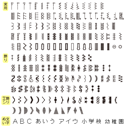 ※表示模様以外にも、大型飾り模様、サテン模様、文字模様(アルファベット/ひらがな/カタカナ)などのステッチを内蔵しています。